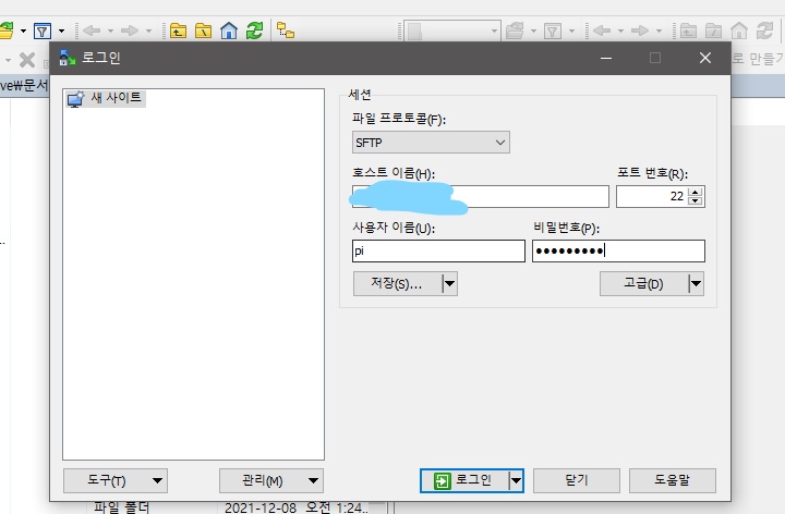 그리고 위처럼 로그인 창이 뜰텐데, 호스트이름에는 라즈베리파이의 IP, 사용자이름과 비밀번호는