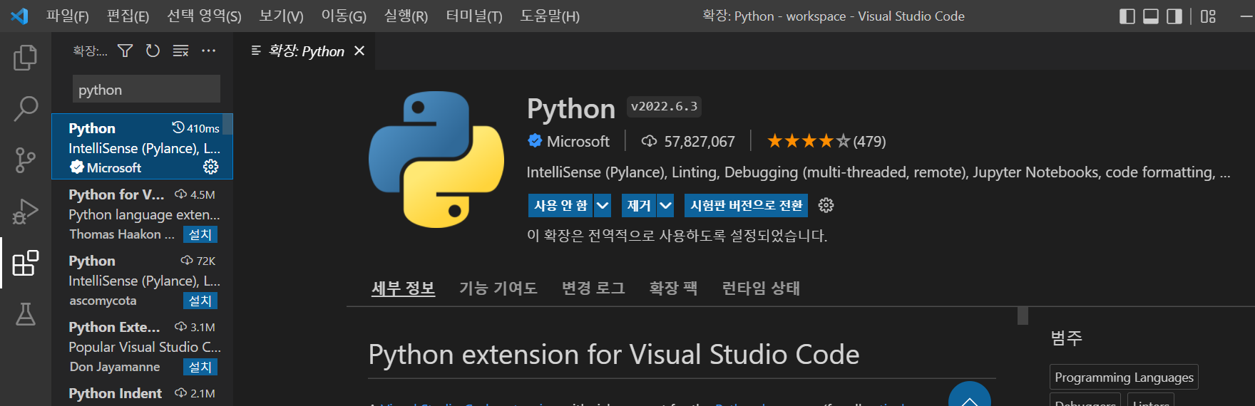 VScode의 왼쪽 바에서 5번째 아이콘, 확장프로그램을 클릭하고 검색창에 'python'이라고 칩니다.