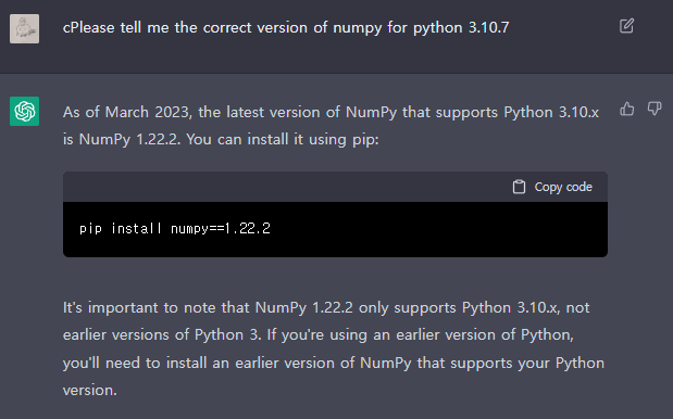 그럼 이렇게 질문했더니, 3.10.x에 맞는 numpy는 1.22.2라고 대답해주네요! (cPlease는 오타가 났네요.)