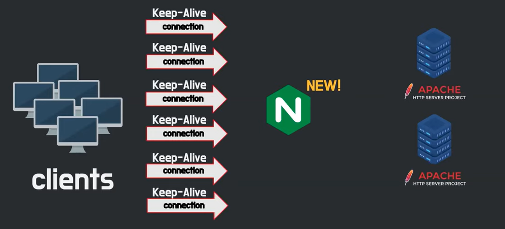 초기의 Nginx는 Apache와 같이 사용하기 위해서 만들어졌다. apache 서버의 구조적 한계를 nginx로 해결하고자 했다. apache서버 앞단에 nginx를 둬서 apache가 감당했던 동시 connection을 nginx가 유지해서 apache의 부하를 줄일 수 있었다. 또한 nginx는 자체로 웹서버라 정적파일을 처리할 수 있었다. 동적파일이 들어왔을 때만 apache와 connection을 유지했다.