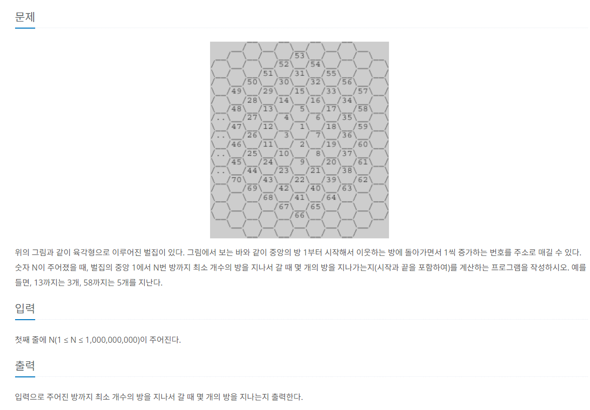 위의 그림과 같이 육각형으로 이루어진 벌집이 있다. 그림에서 보는 바와 같이 중앙의 방 1부터 시작해서 이웃하는 방에 돌아가면서 1씩 증가하는 번호를 주소로 매길 수 있다. 숫자 N이 주어졌