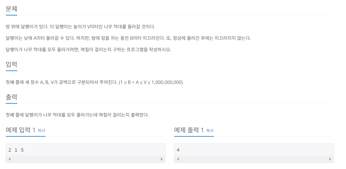 도착하면, 미끄러지지 않으므로 미끄러지는 상황을 제외한, (V-B)에 도달하면 도착한 것으로 한다. 이렇게 하면, 마지막날 내려간 날까지를 포함하게 되므로 (V-B-1)로 한다. 이 값을 하루에 움직이는 거리 (A - B)로 나눈다. 목표 지점에 도달했을 때 더 이상 내려가지 않아도 되기 때문에 +1을 해준다.