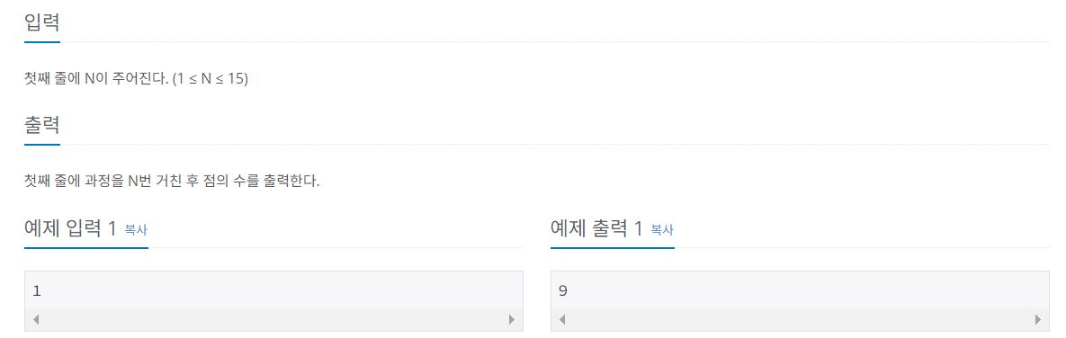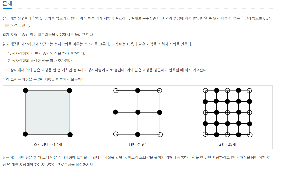 점 사이에 상하좌우, 중앙에 점이 추가되고.. .반복한다...이 과정을 거치고 점 몇개가 존재하는가에 대한 문제이다.