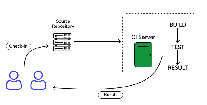 CI는 CI서버를 통해서 위의 과정처럼 Git으로 관리되는 코드의 변경을 감지하고 자동으로 빌드와 테스트를 실행해줍니다.