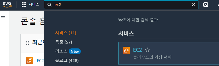 이후 검색을 통해 EC2를 선택해주도록 합니다. EC2(Elastic Compute Cloud)는 아마존에서 제공하는 클라우드 컴퓨팅 서비스로, 가상의 컴퓨터를 임대할 수 있습니다. 피시방 후불제 처럼 사용한 만큼 지불하기 때문에 탄력적이라는 의미인 Elastic이 붙었습니다. 원하는 만큼의 스펙은 커스텀할 수 있어 지불하는 비용이 달라집니다.