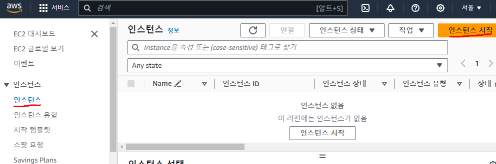 EC2를 들어와서 인스턴스로 들어옵니다. 그리고 인스턴스를 생성해주겠습니다.