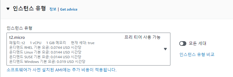 인스턴스 유형은 프리티어가 사용가능한 t2.micro를 선택해줍니다. 여기서 프리티어는 가입한지 1년내의 고객을 의미하며, AWS는 사용할때마다 요금이 나가는데, 프리티어유저는 어느 정도의 서비스를 무료로 이용할 수 있습니다. 이를 위해서 프리 티어용 옵션들을 선택해주겠습니다.
