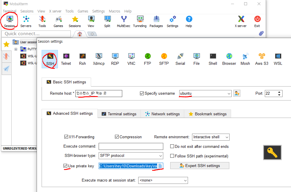 - Advanced SSH settings 클릭 한 후 User private key에서 방금 인스턴스를 생성하면서 발급받은 키를 넣어줍니다.