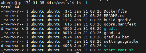 이제 빌드를 해서 다운받은 프로젝트 파일을 실행가능한 jar파일로 만들어 주겠습니다. 프로젝트 안으로 들어와서 ls로 내부를 확인해보면, gradlew이라는 파일이 있는 것을 확인할 수 있습니다. 이 실행파일로 프로젝트를 jar로 변환할 수 있습니다. 하지만 현재 권한이 -rw 로 x, 즉 실행권한이 없는 것을 확인할 수 있습니다.