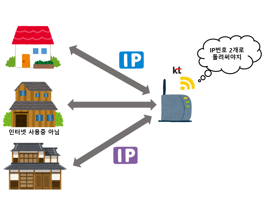 예를들어 위처럼 공유기에 여러집이 물려있고, 통신사에는 연결된 집들에게 인터넷을 사용하도록 IP주소를 할당해줍니다. 하지만 예를들어 연결된집이 3개라고 해서 3개의 IP주소를 할당해주지 않습니다. 개인적으로 인터넷을 사용하는 사람들은 사용하는 시간이 있고, 나머지 시간에는 사용하지 않습니다.