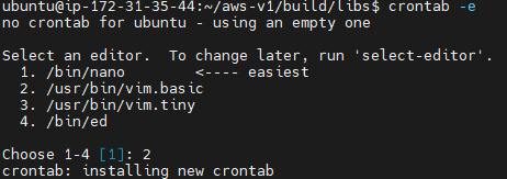 crontab -e를 통해서 crontab을 생성해줍니다. 이후에 어떤 에디터로 작성할지를 묻는데, 저는 vi에디터가 편해서 2번을 선택하겠습니다.
